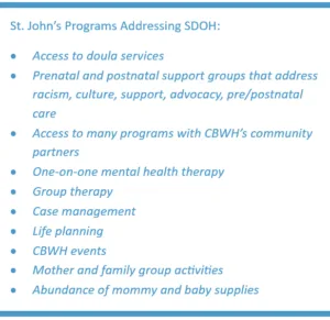 The most prevalent SDOH among St. John’s perinatal patients include racism in health care, access to quality health care, material poverty, unemployment, lack of housing, nutrition and food insecurity. offers several programs to address patients’ SDOH needs. The goal of the Committed to Black Wellness and Health Program (CBWH) is to promote health equity, improve Black maternal and infant health outcomes, empower Black mothers to thrive, and ensure accountability within medical institutions for instances of racial discrimination and bias.